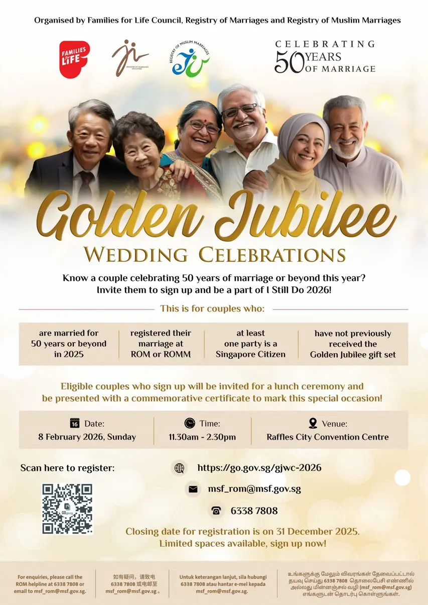 Know an eligible Golden Jubilee couple? Nominate them or help them register at go.gov.sg/gjwc-2026 . Successfully registered couples will be invited to a lunch reception and receive a Golden Jubilee gift set.