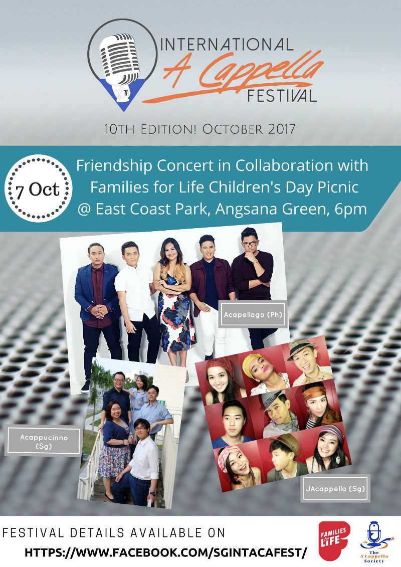 Acappucinno is a group of friends who met in junior college over ten years ago. They have since brought their music to Hong Kong and Taiwan. JAcappella is a dynamic team made up of our national carriers attendants from Singapore and Malaysia. Soothing and classy, they will serve up a delightful selection of songs and arrangements this Sunday! Special guest, Acapellago from The Philippines is an award-winning team that has sung and competed all over the world from Singapore to Taiwan to Austria in Europe and more! Sensational and mind-blowing are terms to describe their voices and their arrangements. You don't want to miss this set! More details about The 10th International A Cappella Festival.